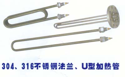 不銹鋼法蘭、U型加熱管法蘭間用襯墊密封。在耐高溫不銹鋼無(wú)縫管內(nèi)均勻地分布高溫電阻絲,在空隙部分致密地填入導(dǎo)熱性能和絕緣性能均良好的結(jié)晶氧化鎂粉,這種結(jié)構(gòu)不但先進(jìn),熱效率高,而且發(fā)熱均勻,當(dāng)高溫電阻絲中有電流通過(guò)時(shí),產(chǎn)生的熱通過(guò)結(jié)晶氧化鎂粉向金屬管表面擴(kuò)散,再傳遞到被加熱件或水中去,達(dá)到加熱的目的。